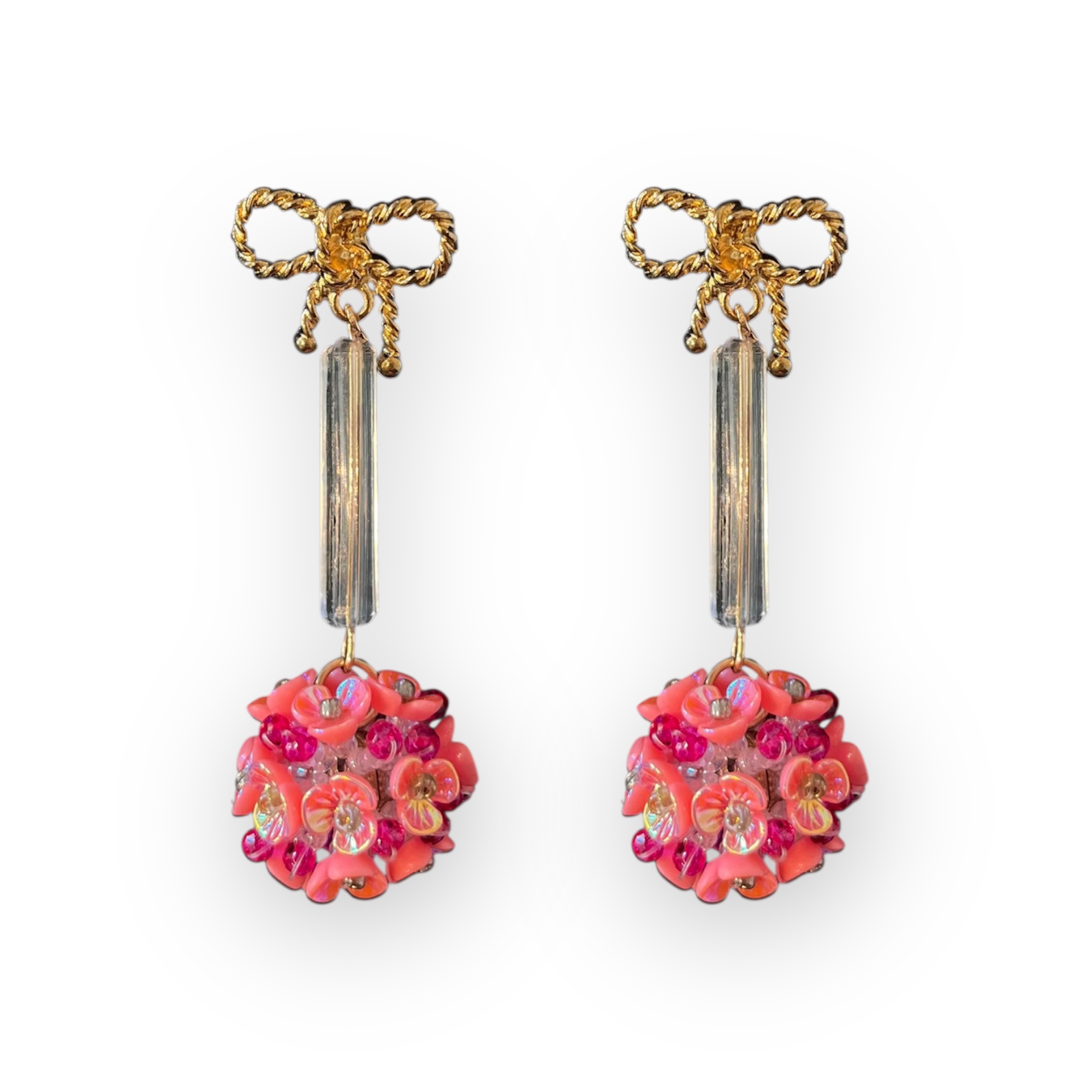 Pendientes lazo y bola florecitas fucsia