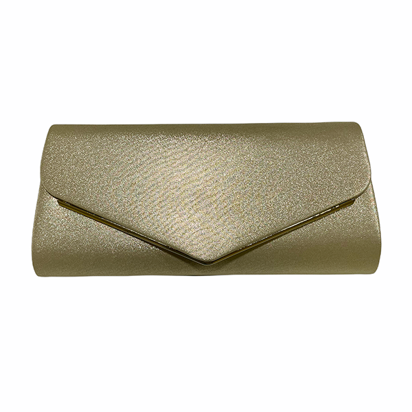 Bolso tipo cartera/sobre de tela en tono champagne con destellos.