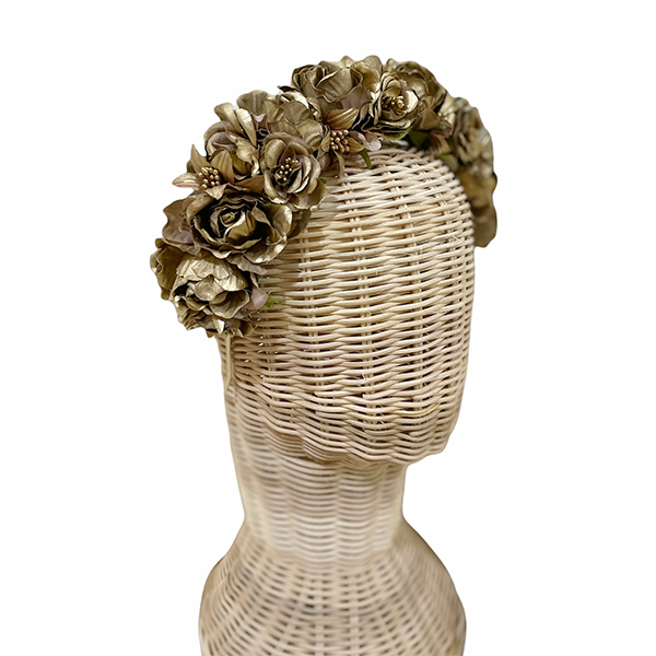 Diadema con distintos tipos de flores y pistilos dorados. Combinable con cualquier look de invitada, flamenca o para un evento especial.