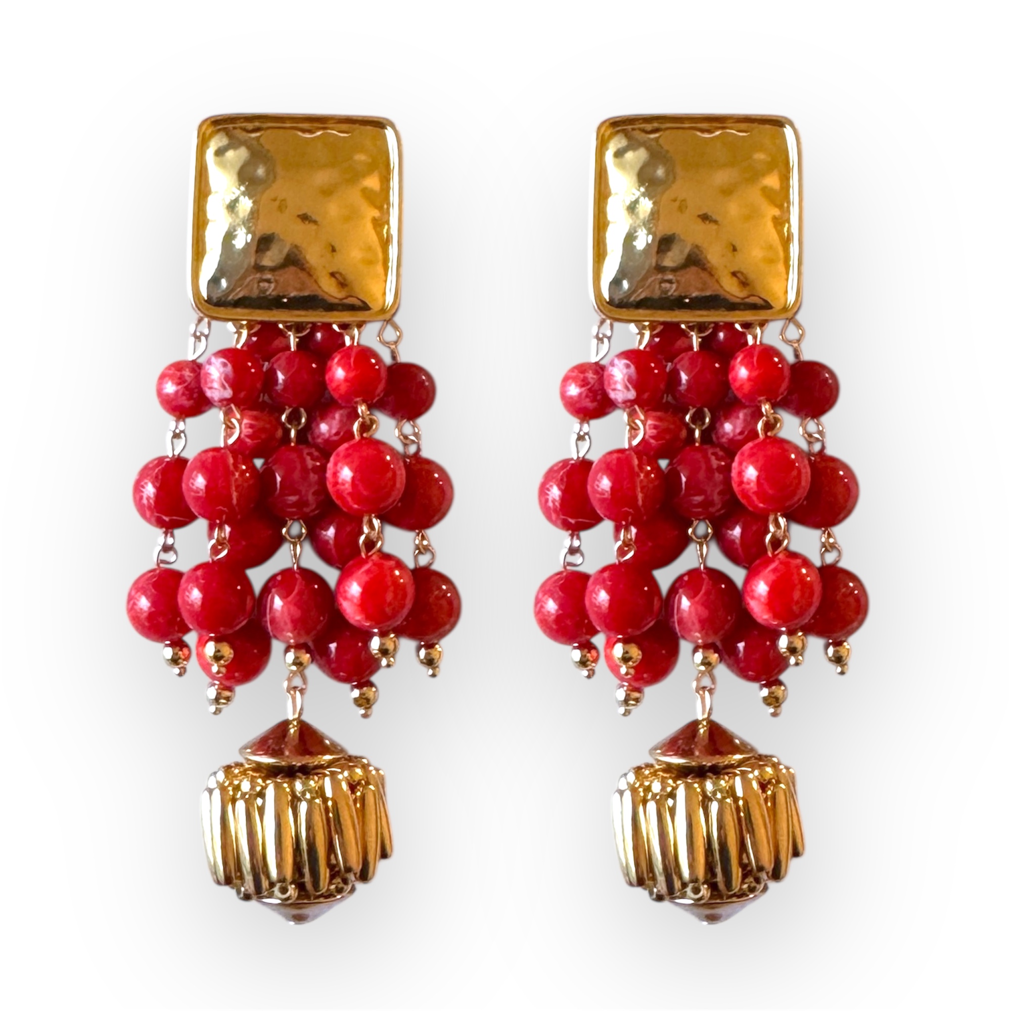 Pendientes cuadrado oro y cascada bolas rojo
