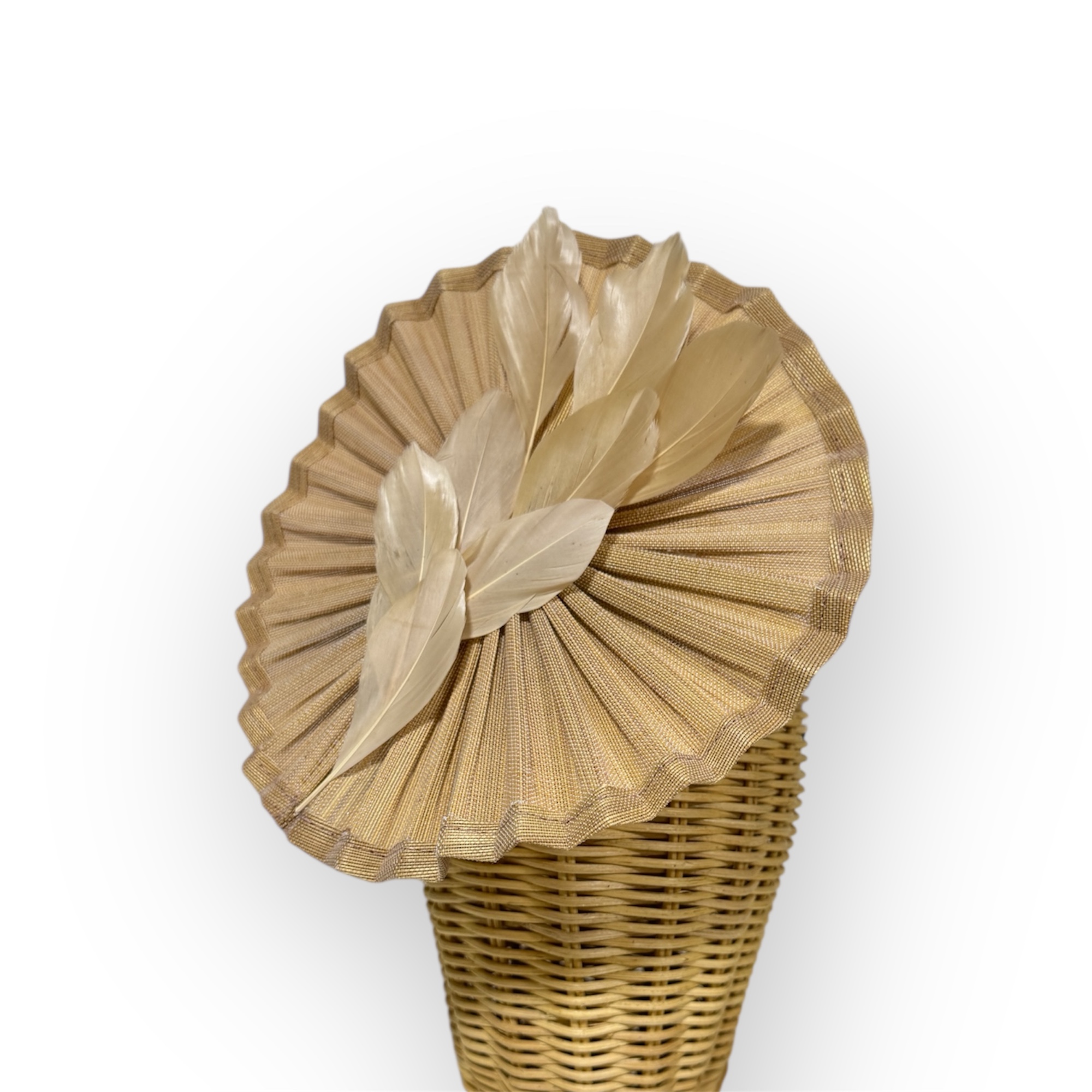 Tocado de sinamay y plumas. Lleva diadema como sujeción. Diámetro: 22cm.