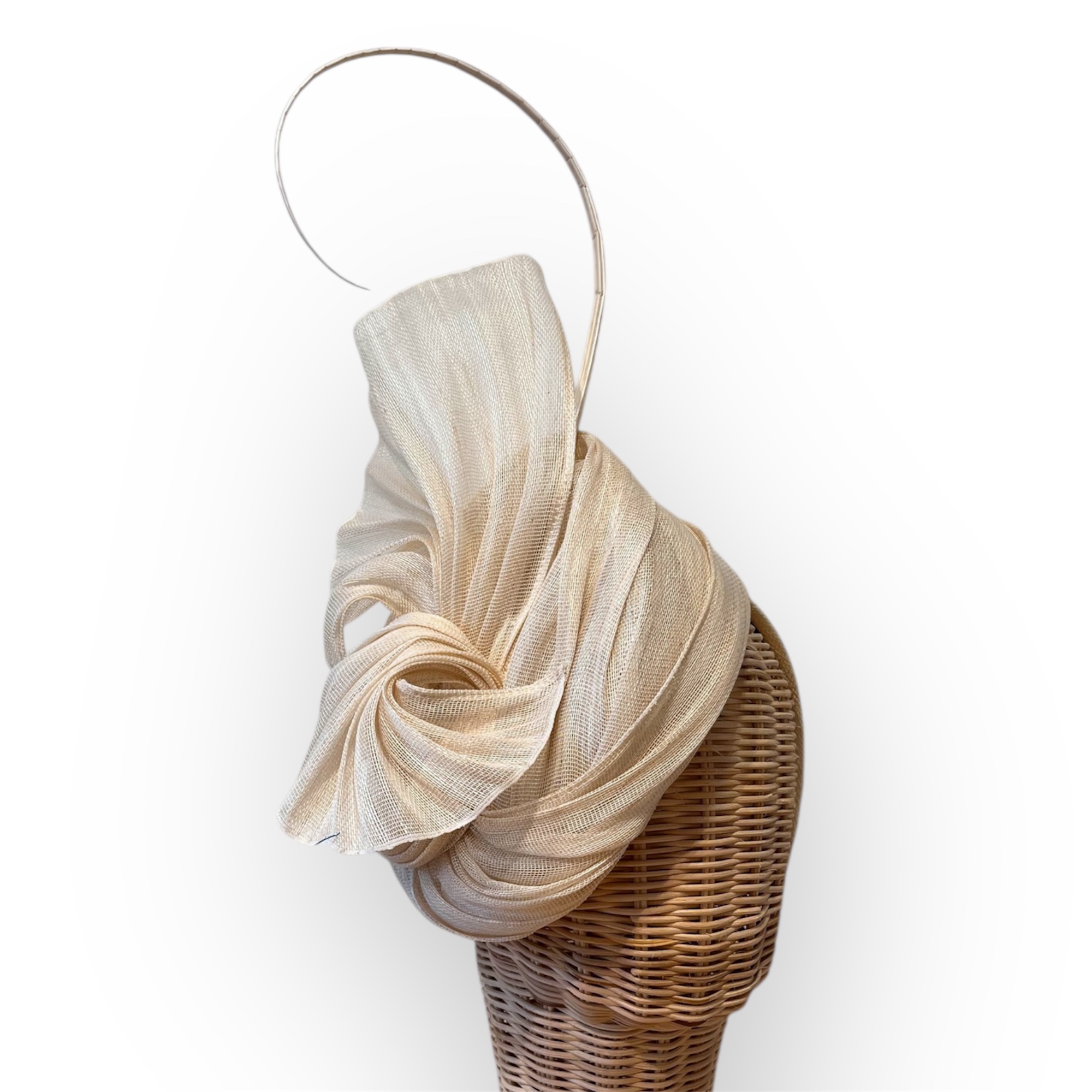 Tocado de sinamay y esquí de pluma. Lleva diadema como sujeción. Diámetro: 25cm